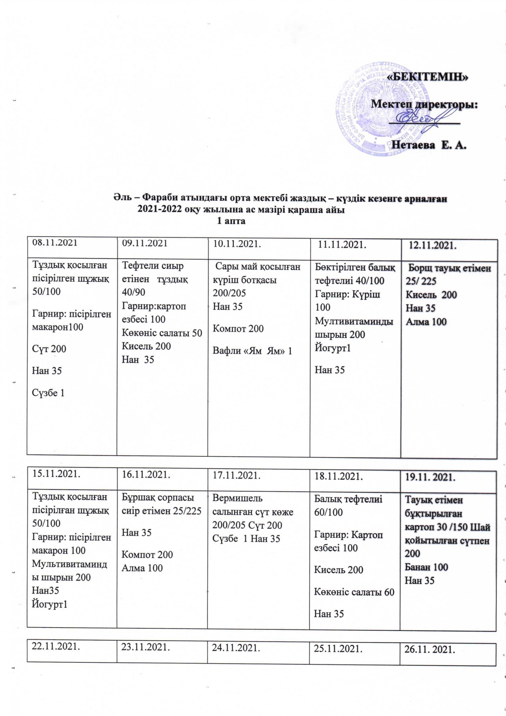 Мектеп асханасының 2021-22 оқу жылы қараша айының ас-мәзірі » Әл-ФарабиСредняя школа имени